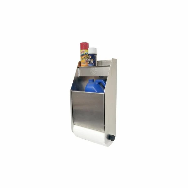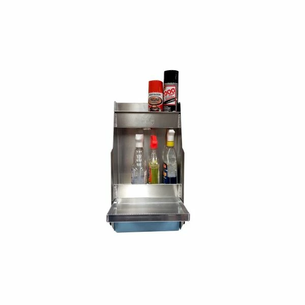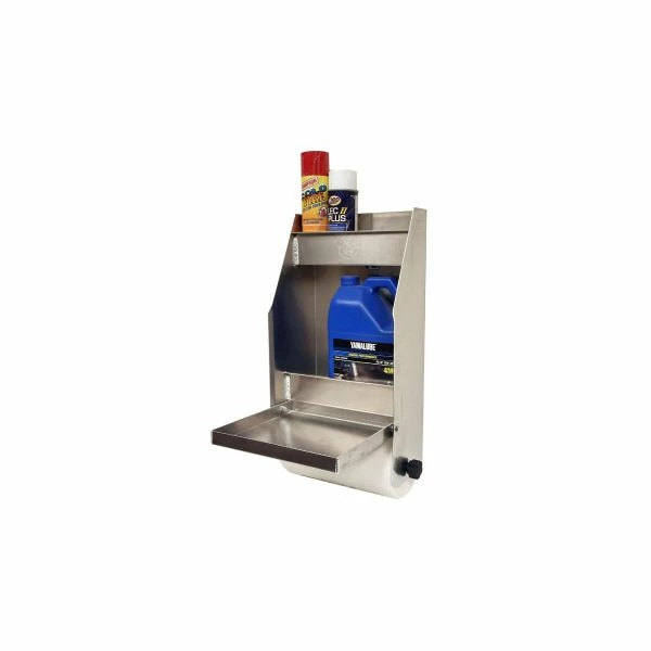 Our deluxe junior door cabinet has a deeper lower shelf to store gallon containers or oil quarts side by side for additional storage measuring 4.5″D. The top shelf holds aerosol cans and the flip down tray holds small parts while working.