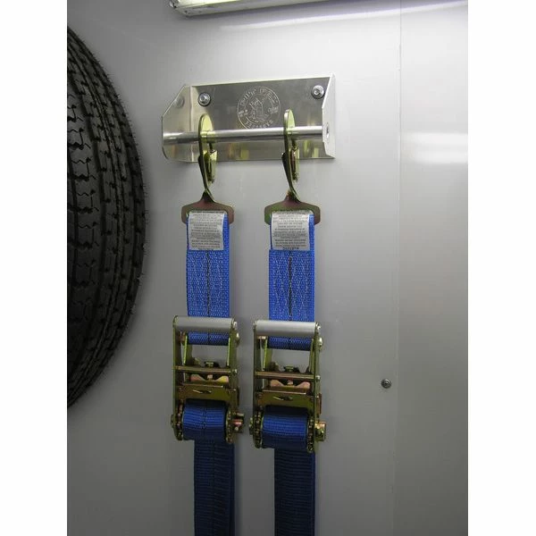 Neatly stores ratchet tie downs on trailer wall while at an event. Creates more floor space. Store 2 ratchet tie downs per unit.