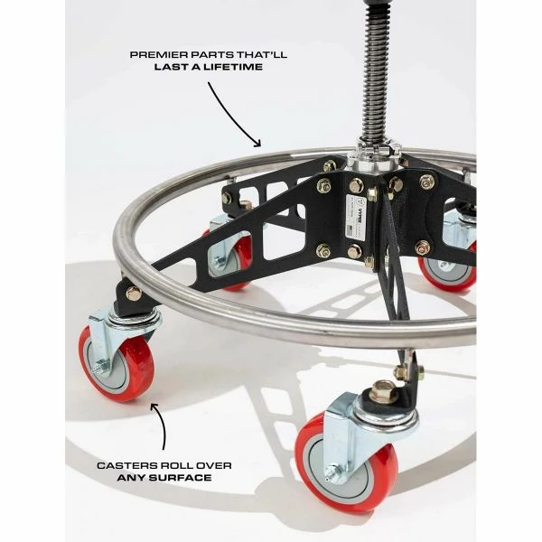 The Vyper Chair was designed with a sturdy base to prevent tipping over. The base also helps roll over cracks or rugged surfaces, increases weight holding capacity and is a great spot to rest your foot.